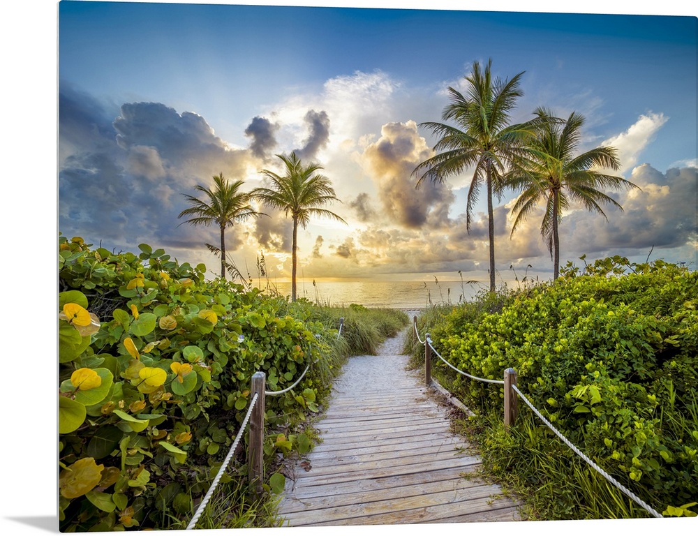 <p>Wooden Path to the Beach surrounded by palm trees, Hollywood Beach, Hollywood, Miami Beach Florida, USA</p>
