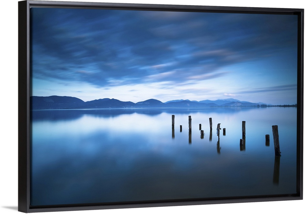 <p>Wooden pier or jetty remains on blue lake, sunset and sky reflection water. Long exposure, Versilia Massaciuccoli, Tuscany, Italy.</p>