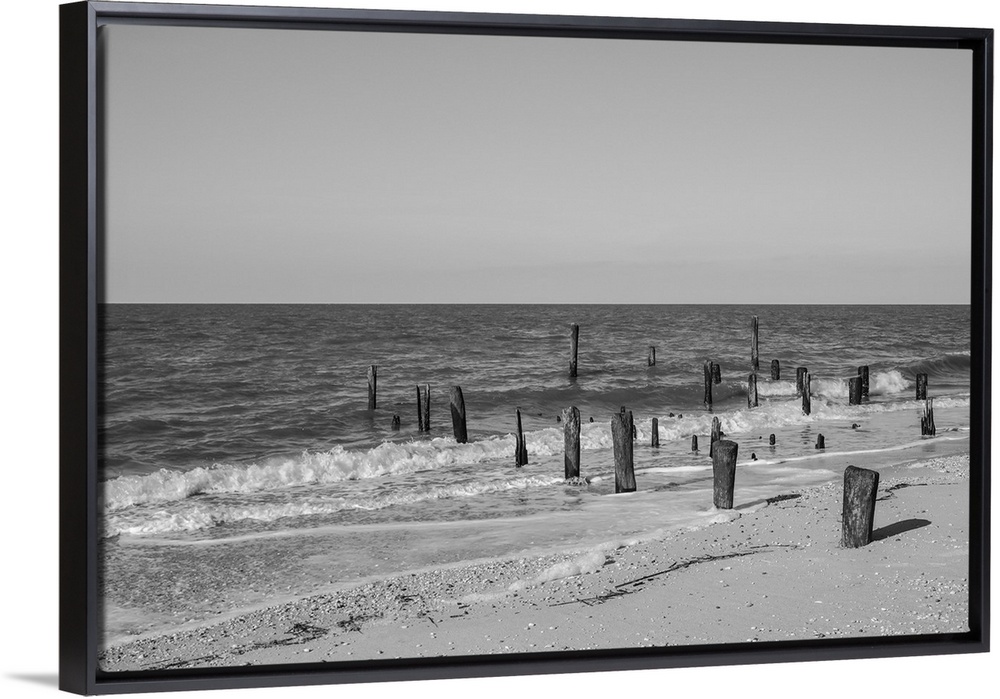 <p>Exterior daytime black and white stock of wooden pylons rising from the sand on Cape May, New Jersey beach on the Delaware Bay in Cape May County as waves come in on winter December afternoon</p>