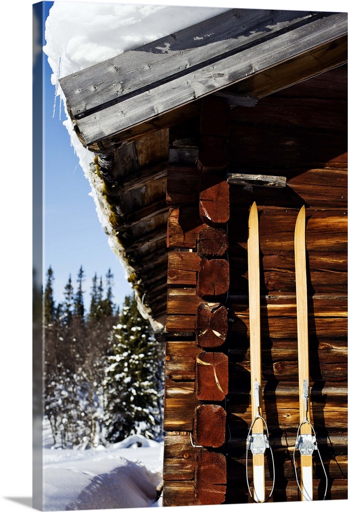 Wooden skies leaning against log cabin in winter