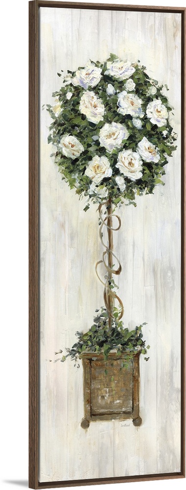 <p>A contemporary still life painting of a topiary with white flowers and a wood grain background.</p>