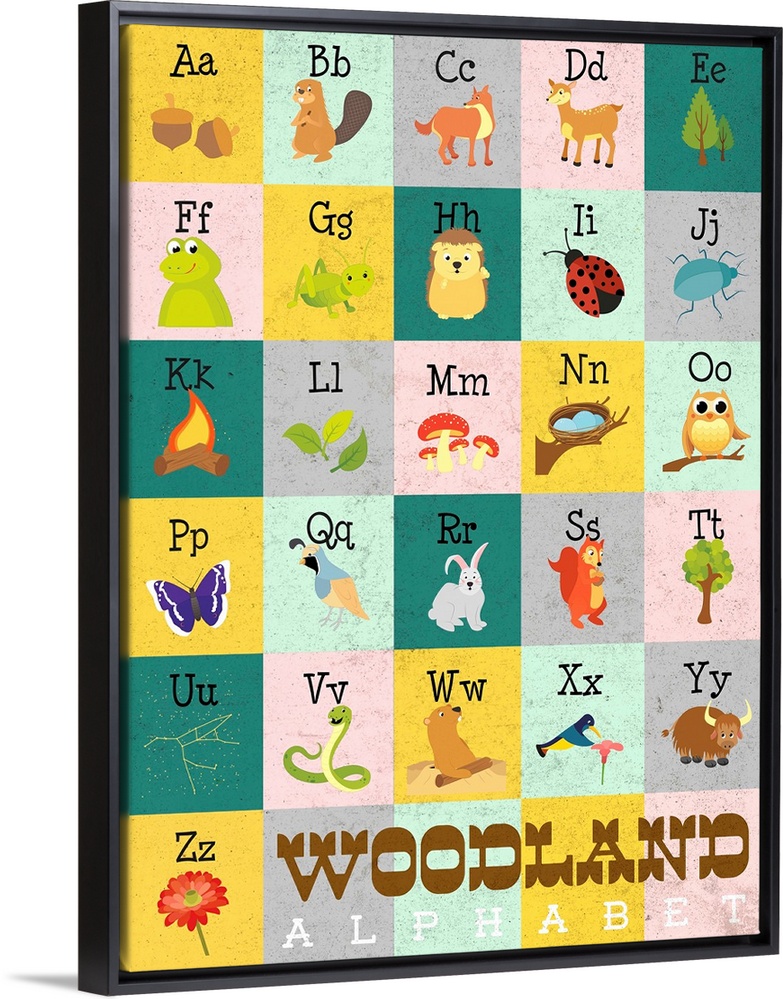 <p>The alphabet illustrated with creatures and objects found in the woods.</p>