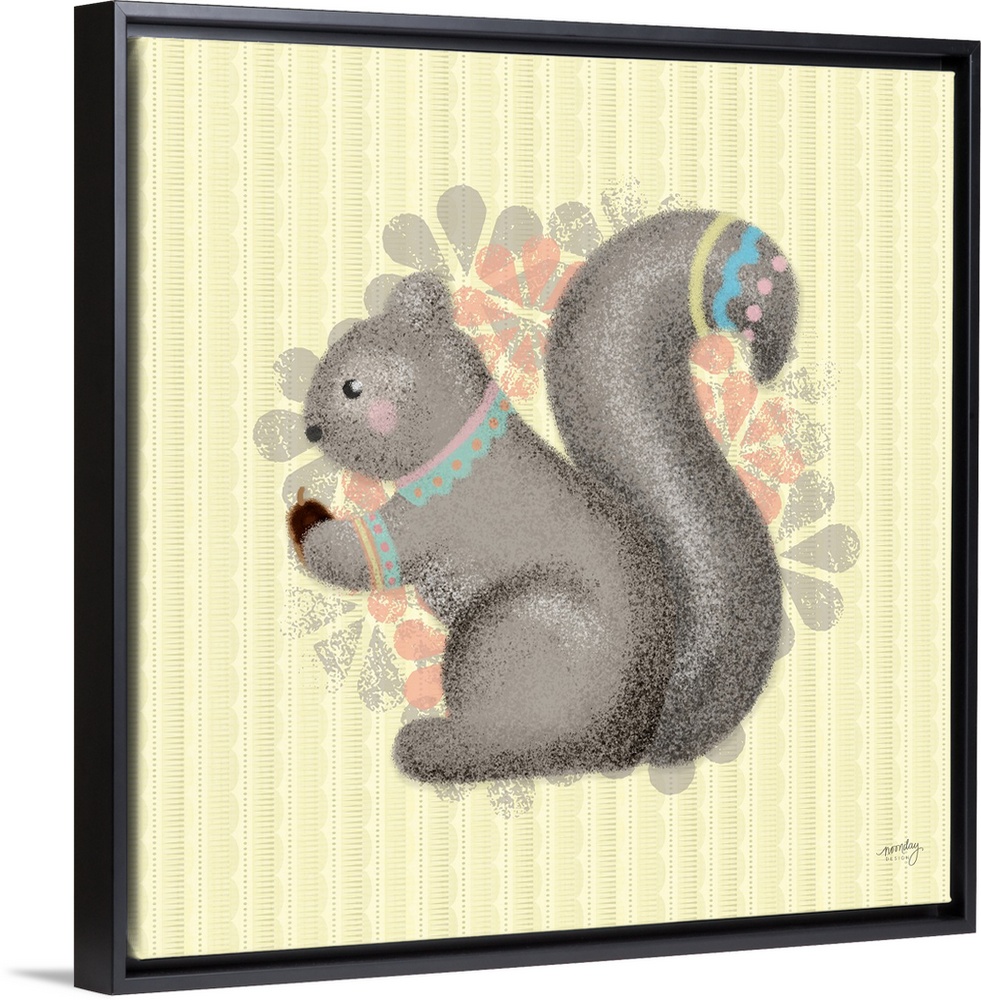 <p>A darling illustration of a squirrel wearing decorative markings on it's neck and tail with a floral pattern on a striped green background.</p>