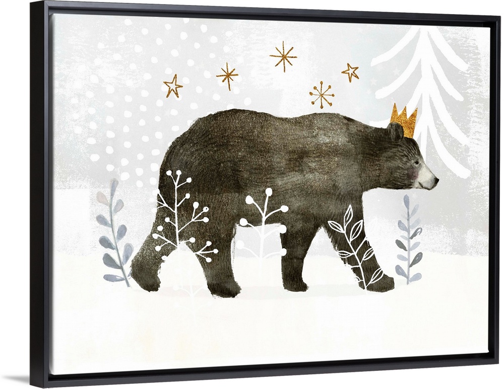 <p>Woodland themed nursery decor featuring a bear in a whimsical snowscape.</p>