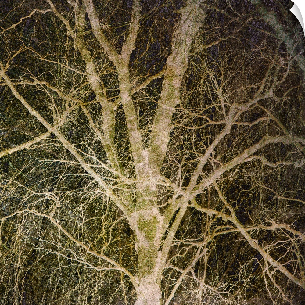 <p>Square photograph of a tree with a lot of branches with a manipulated gold overlay and a dark background.</p>