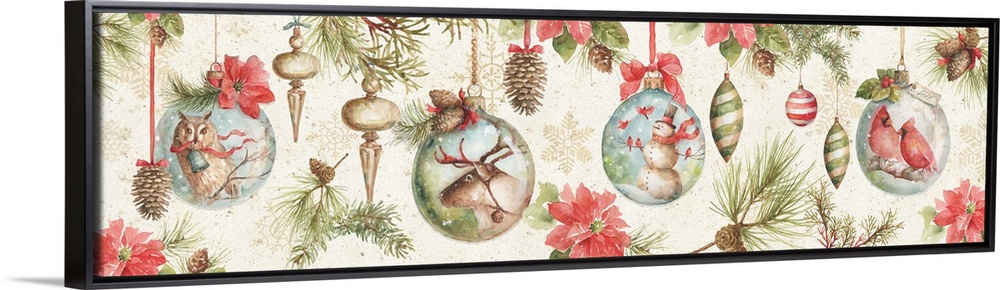 <p>Decorative design of a variety of holiday ornaments on a neutral beige backdrop with snowflakes.</p>