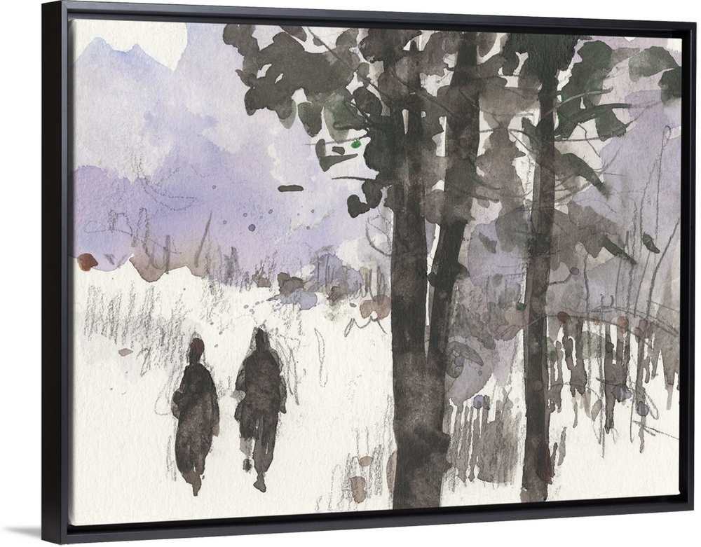 <p>Gestural watercolor painting of trees in the winter with a lavender sky.</p>