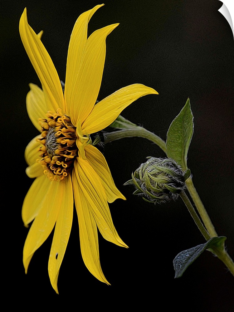 <p>A photograph of a yellow sunflower against a black background.</p>