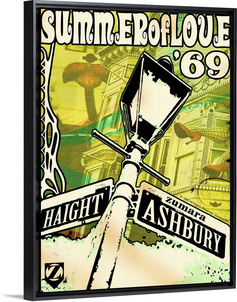 <p>A vintage poster of a street lamp with the street signs Haight and Ashbury on either side. A house in San Francisco is faded in the background.</p>