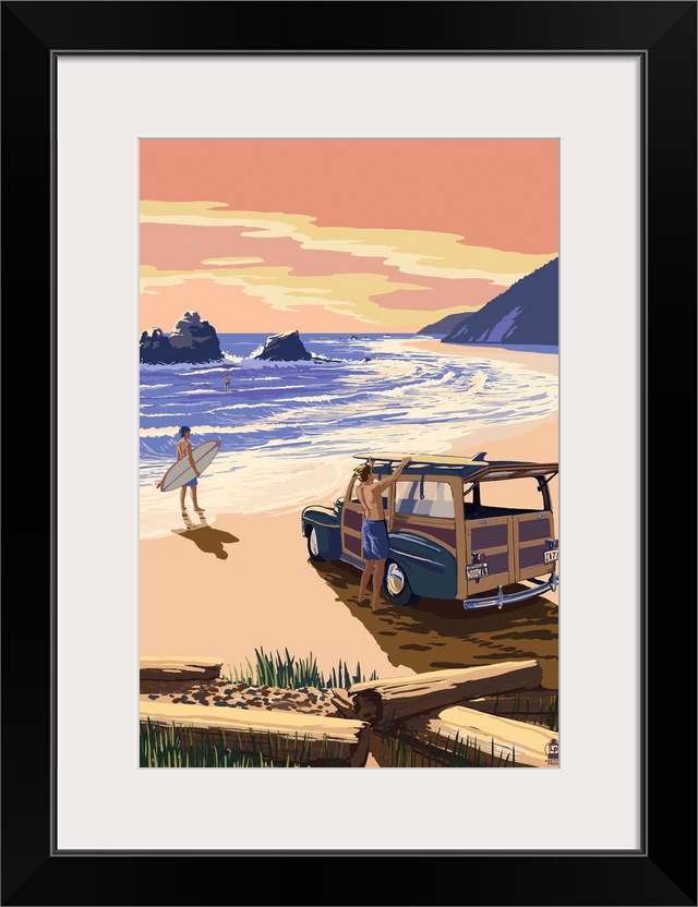 <p>Retro stylized art poster of a vintage woody wagon with surfers on the beach at sunset.</p>