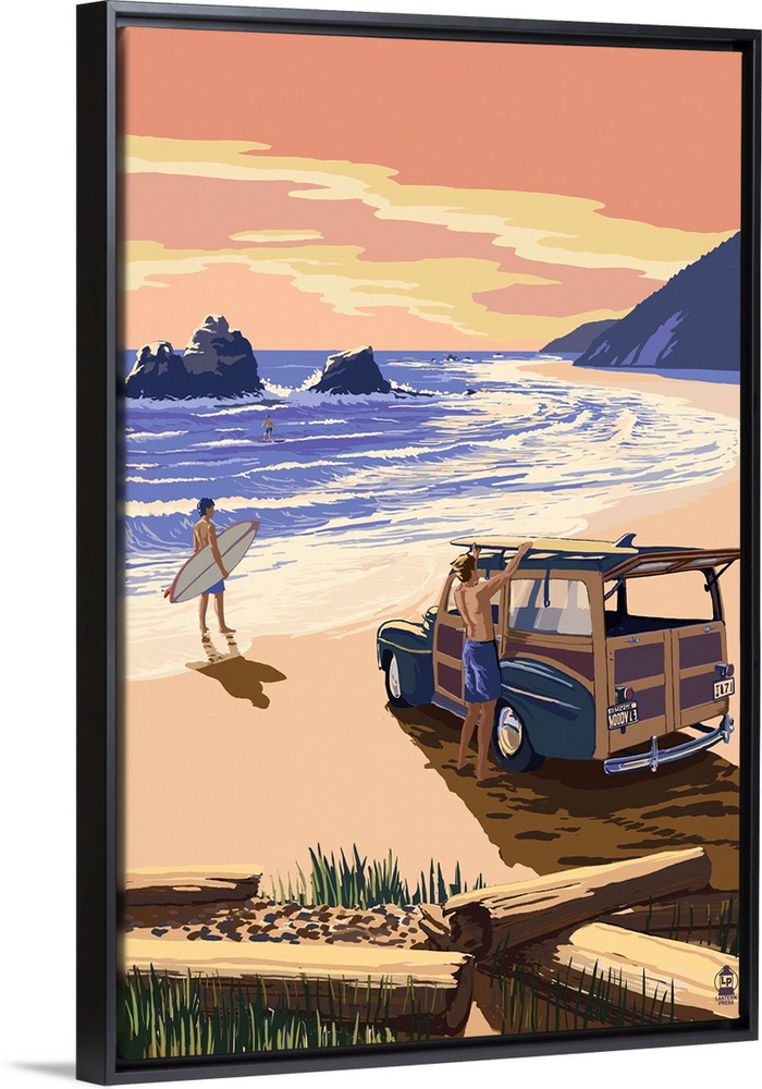<p>Retro stylized art poster of a vintage woody wagon with surfers on the beach at sunset.</p>