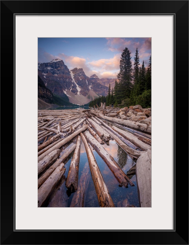 <p>Landscape photograph with logs piled up in a river with snowy mountains in the background.</p>