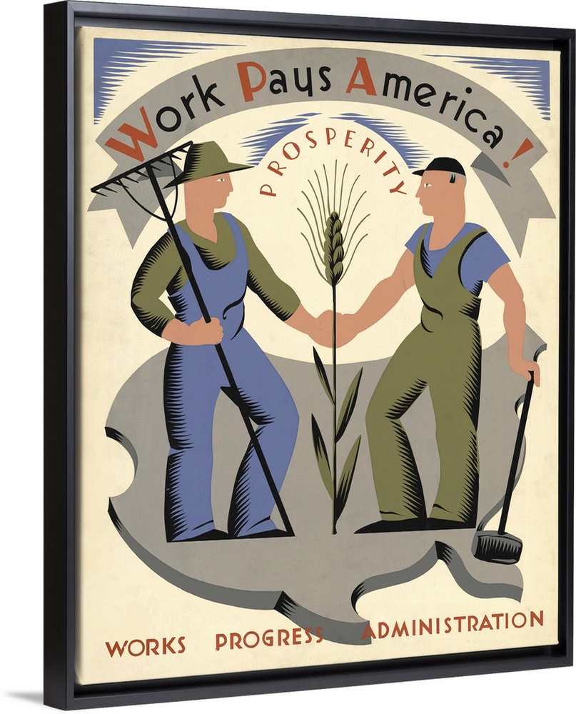 <p>Work pays America! Prosperity. Poster for Works Progress Administration encouraging laborers to work for America, showing a farmer and a laborer. Library of Congress, Prints and Photographs Division, WPA Poster Collection.</p>
