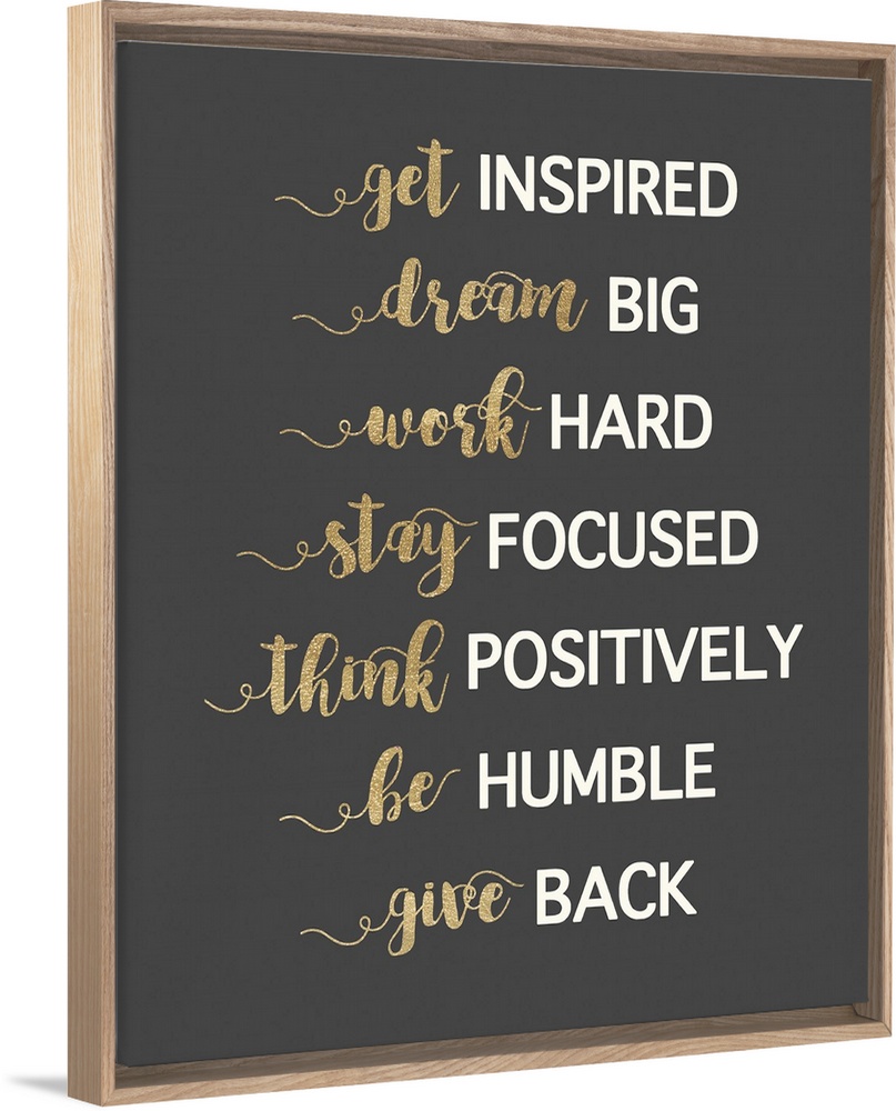 <p>Typography artwork in gold and white on dark grey of motivational phrases.</p>