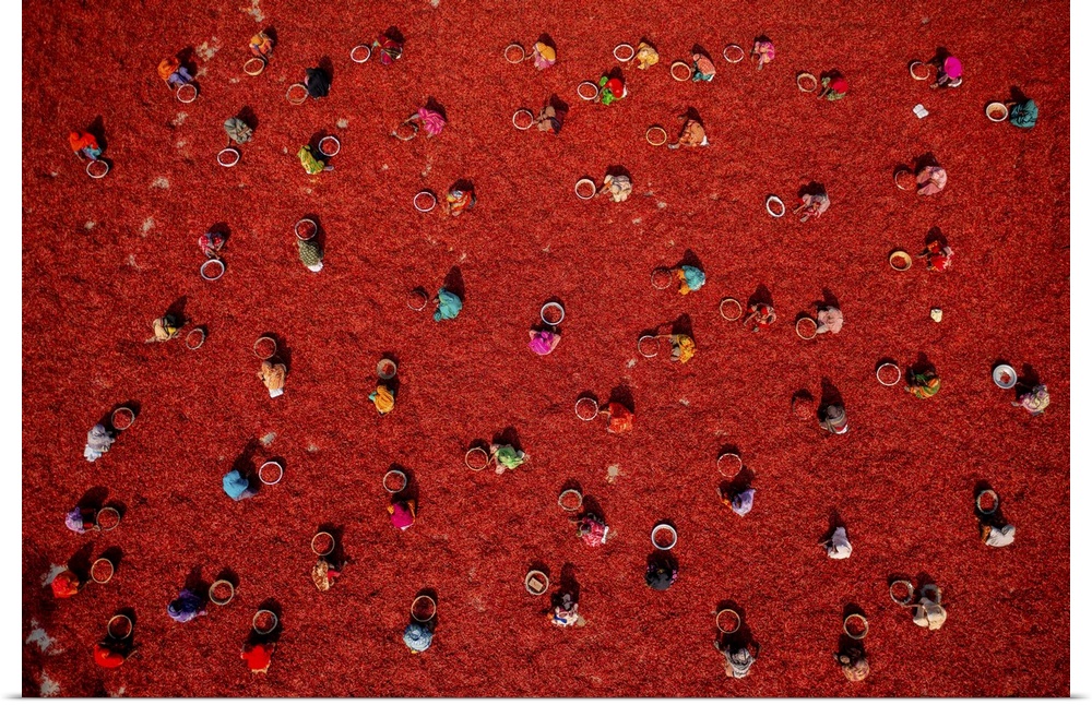 <p>Aerial view of people working in a small farm collecting red chillies In a field, Bogura, Rajshahi province, Bangladesh.</p>