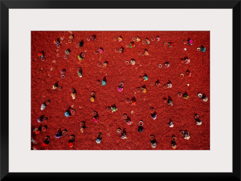 <p>Aerial view of people working in a small farm collecting red chillies In a field, Bogura, Rajshahi province, Bangladesh.</p>