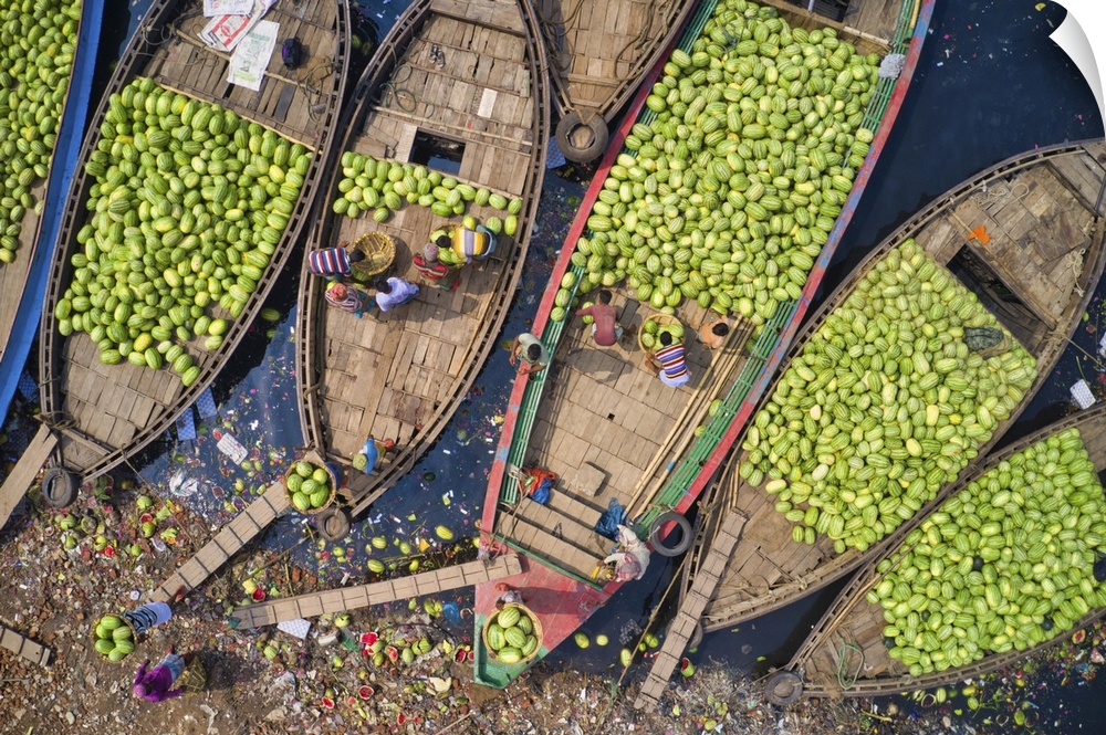 <p>Workers unload watermelons from the boats using big baskets, Sadarghat, Dhaka, Bangladesh. Dhaka, Asia, Dhaka, Bangladesh.</p>
