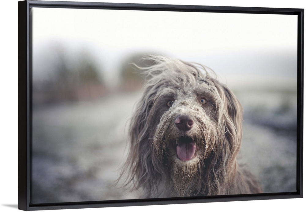 <p>Working Bearded collie dog with a messy face after enjoying some time in the snow.</p>