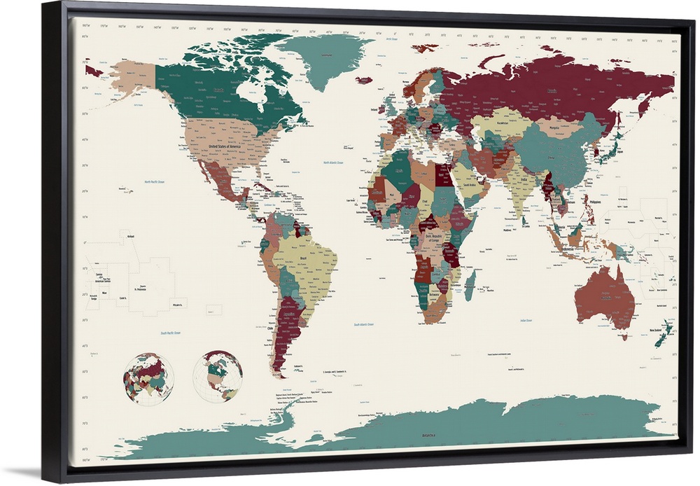 <p>Giant, horizontal wall hanging of the world map with all countries in a variety of colors, on a light background.</p>