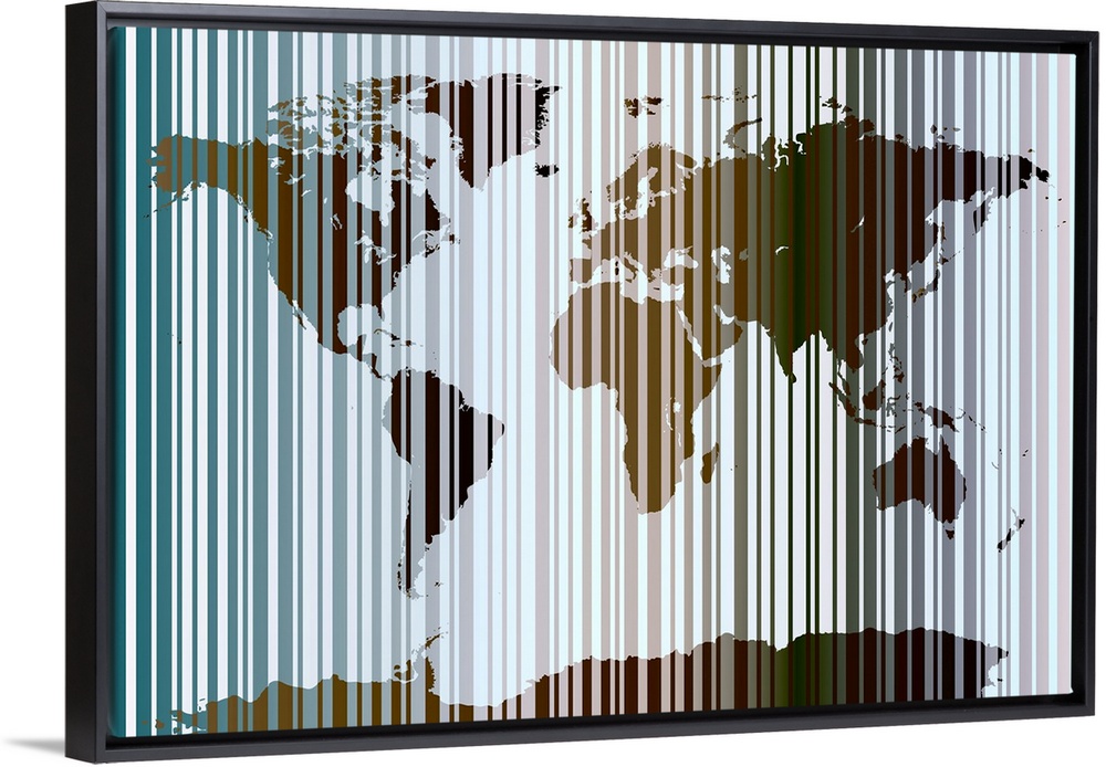 <p>Contemporary piece of a map of the world with different colored vertical stripes running across the print.</p>
