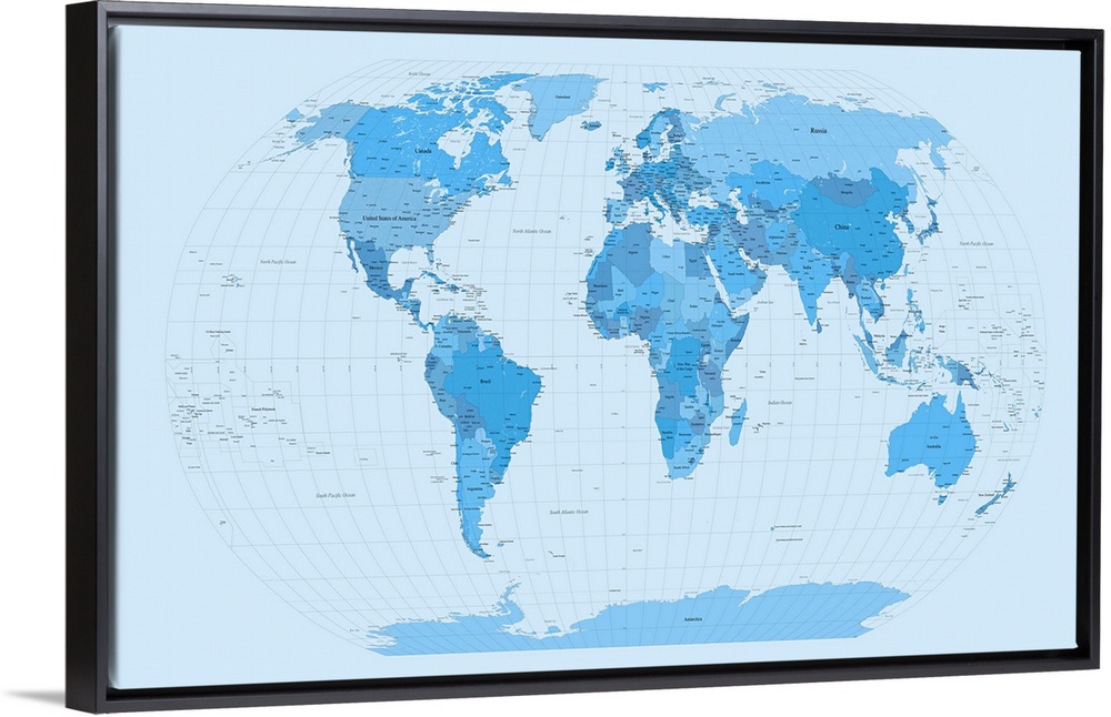 <p>Map of the world with country names, city names, major cities, island names, sea names and graticules showing the curve of the earth. Countries are depicted in blue shades.</p>