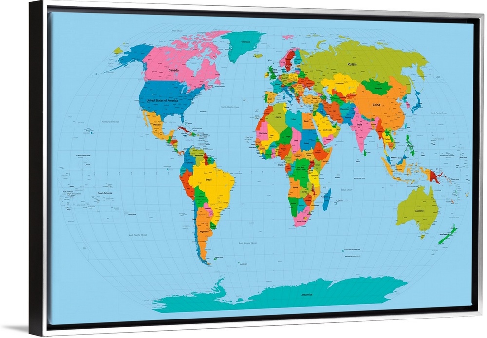 <p>Wall art of a political world map with numbered latitude, longitude lines, and bright colors making this perfect for the classroom.</p>