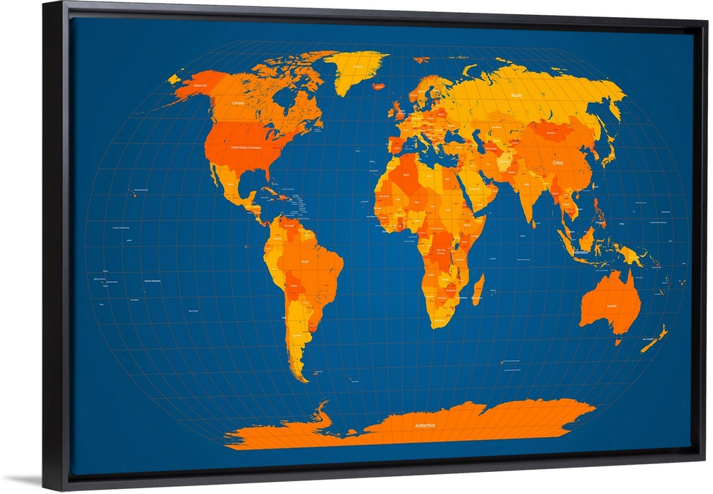 <p>World map labeled with all the countries and oceans with latitude and longitude lines.</p>