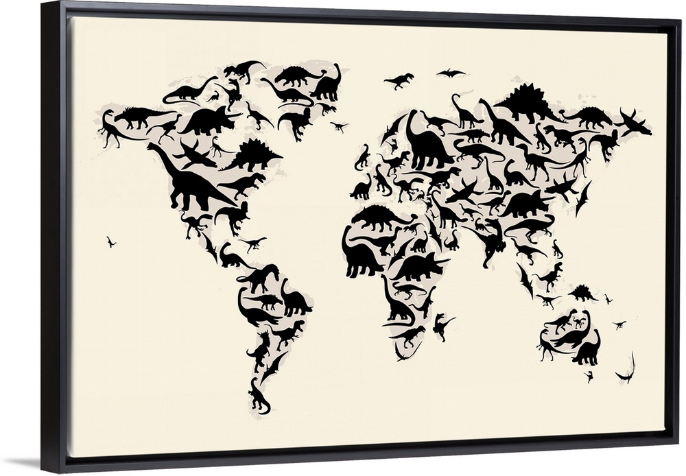 <p>Large, landscape wall hanging of the world map made up of the silhouettes of various dinosaurs, on a solid, light background.</p>