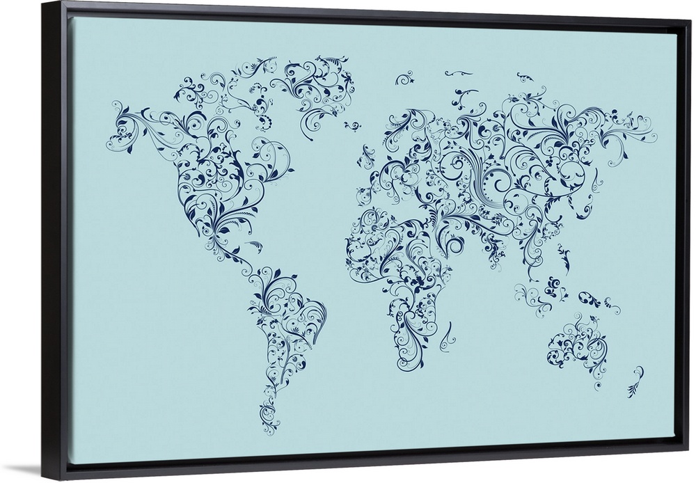 World map made up of Floral Swirls - blue background