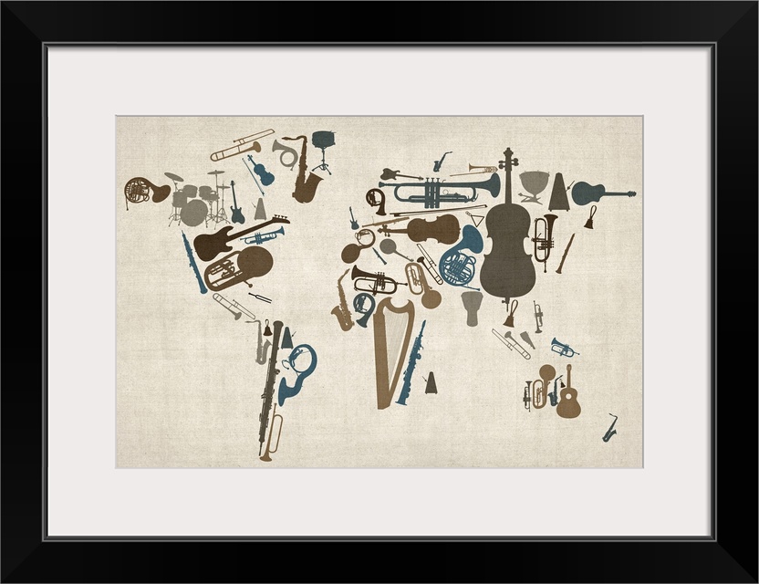 <p>Map of the world with silhouetted instrument shapes as continents. Instruments used include a guitar, drum set, flute, clarinet, trombone, harp, saxophone, trumpet, snare drum, bass, and violin.</p>