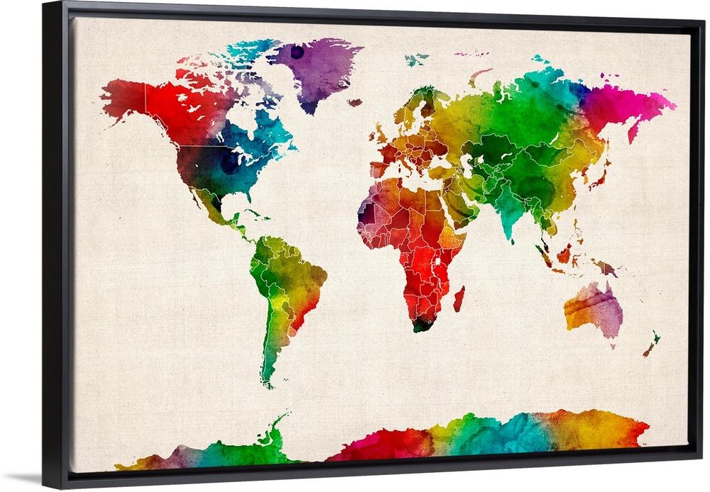 <p>A colorful world map on paper texture that artistically defines all seven continents and outlines the countries; this wall art does not have text ot country names on it.</p>
