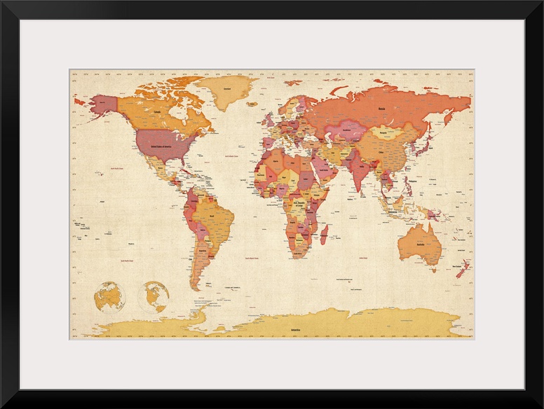 <p>World map labeled with all the countries and oceans in warm color tones.</p>