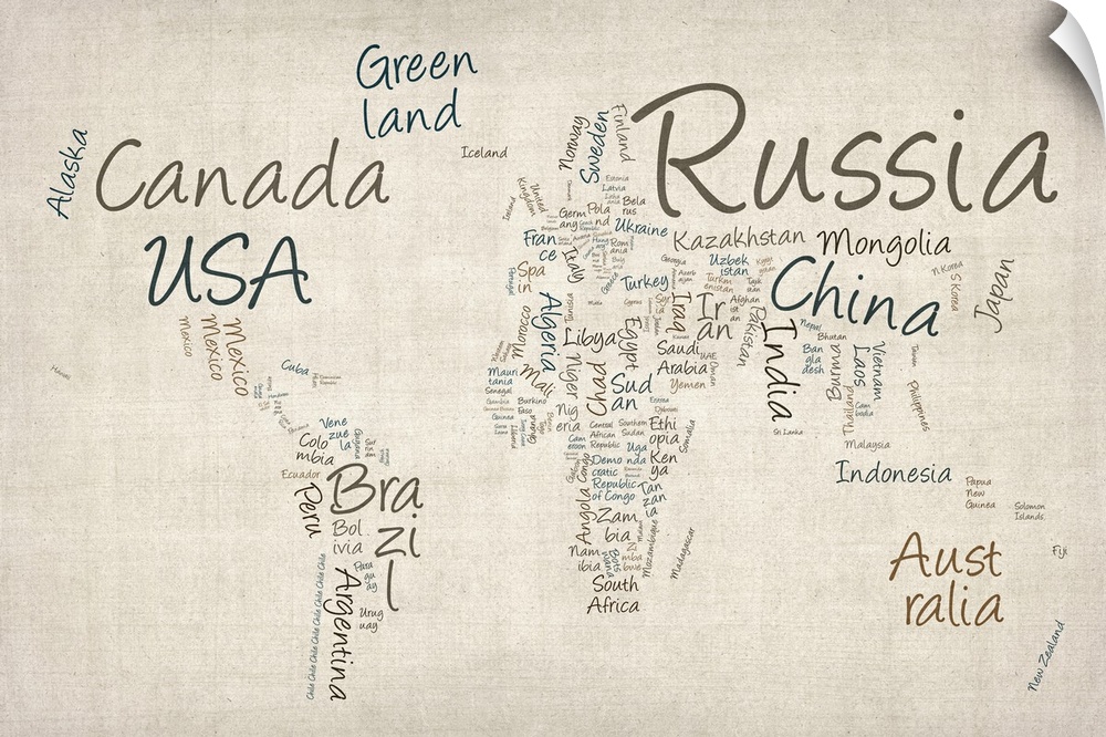 <p>Map of the world with the continent shapes and location made of words.</p>