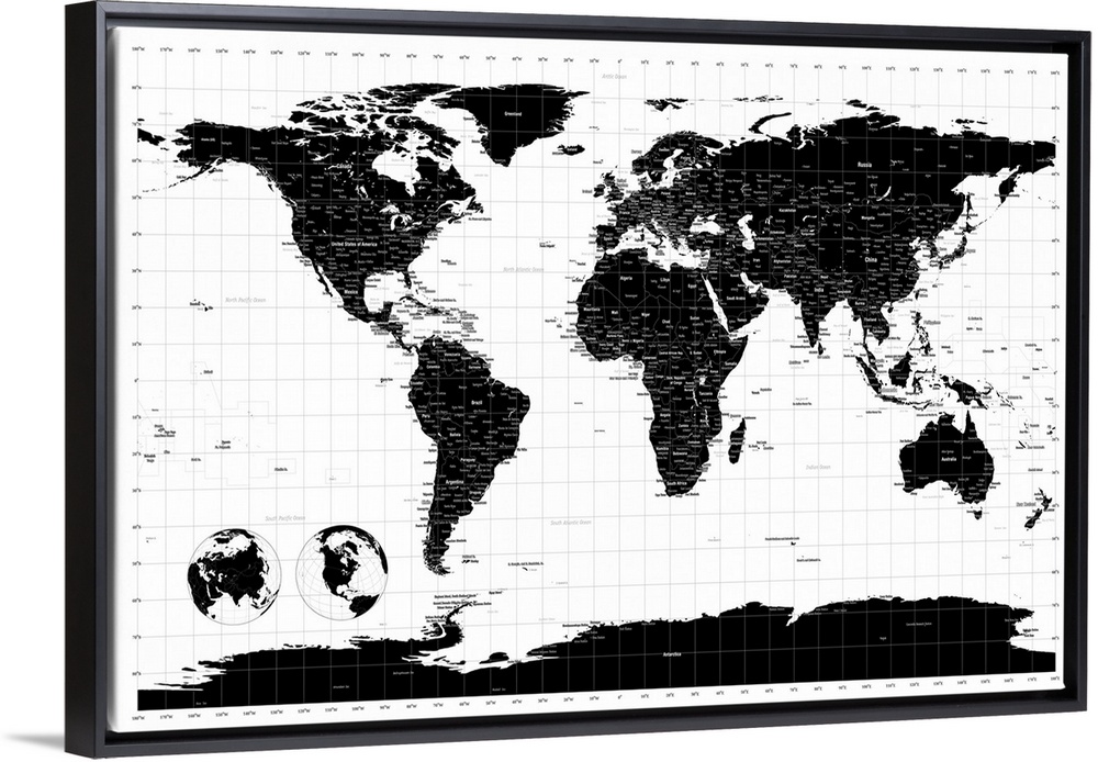 <p>Horizontal, large wall hanging of the world map in black, on a white background, with longitude and latitude lines.</p>