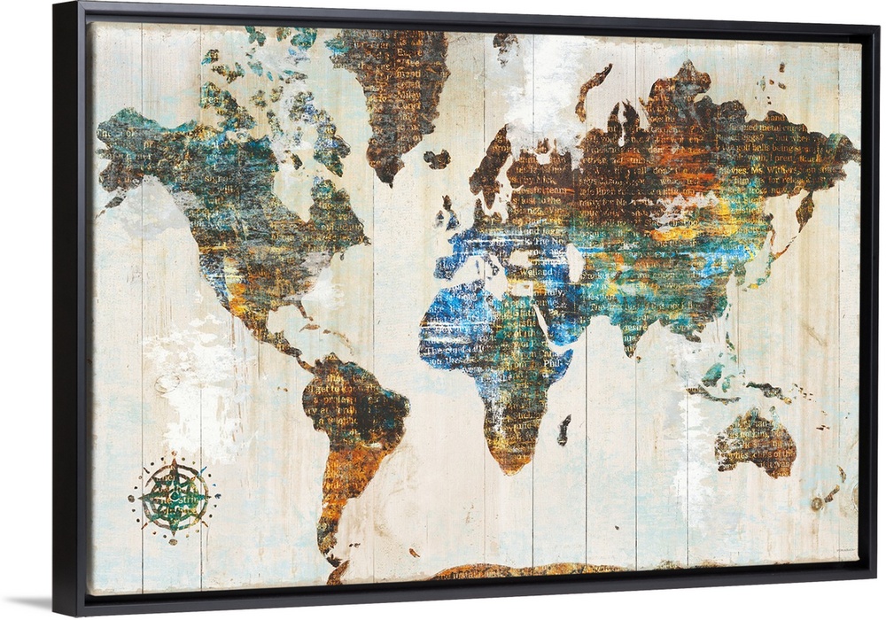 <p>World map made of multi-color textures with text peeping through, on a wood plank backdrop.</p>