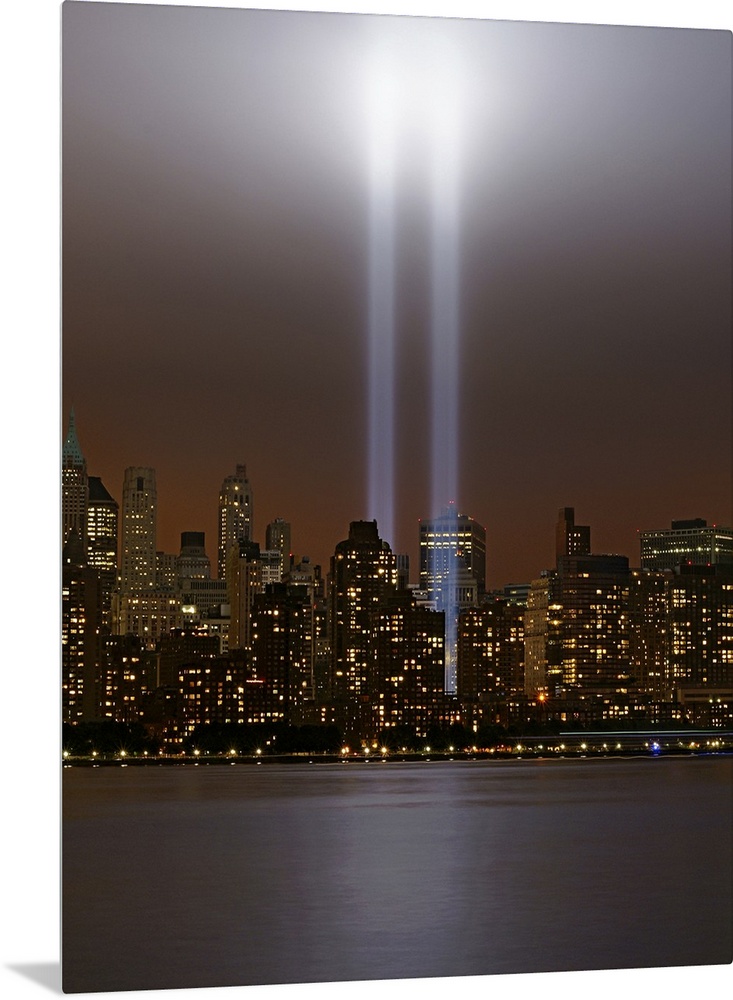 <p>This vertical piece shows two beams of light shining up from where the twin towers stood. The skyline is lit up under a dark night sky.</p>