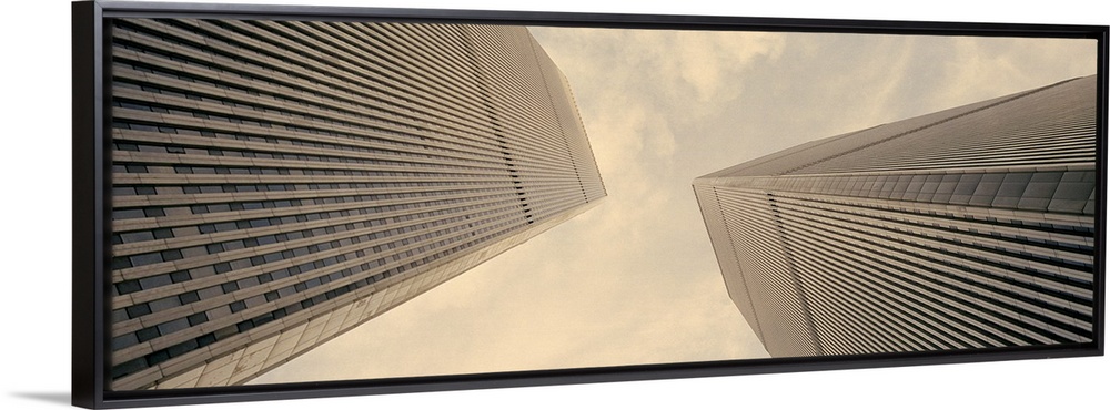 <p>Panoramic photograph taken from the ground looking up at the nicknamed "Twin Towers" as they extend toward the daytime sky. The rectangular windows on the skyscrapers cover all four sides of each building.</p>
