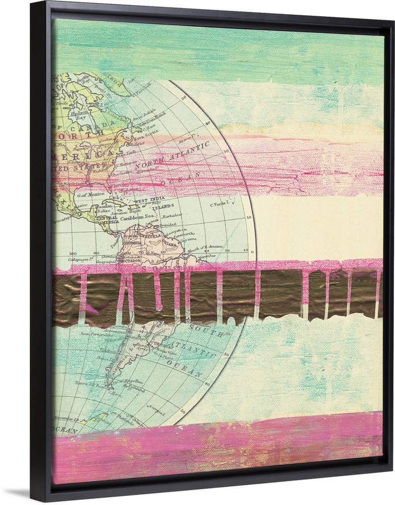 <p>Mixed media artwork with a world map and geometric painted shapes.</p>