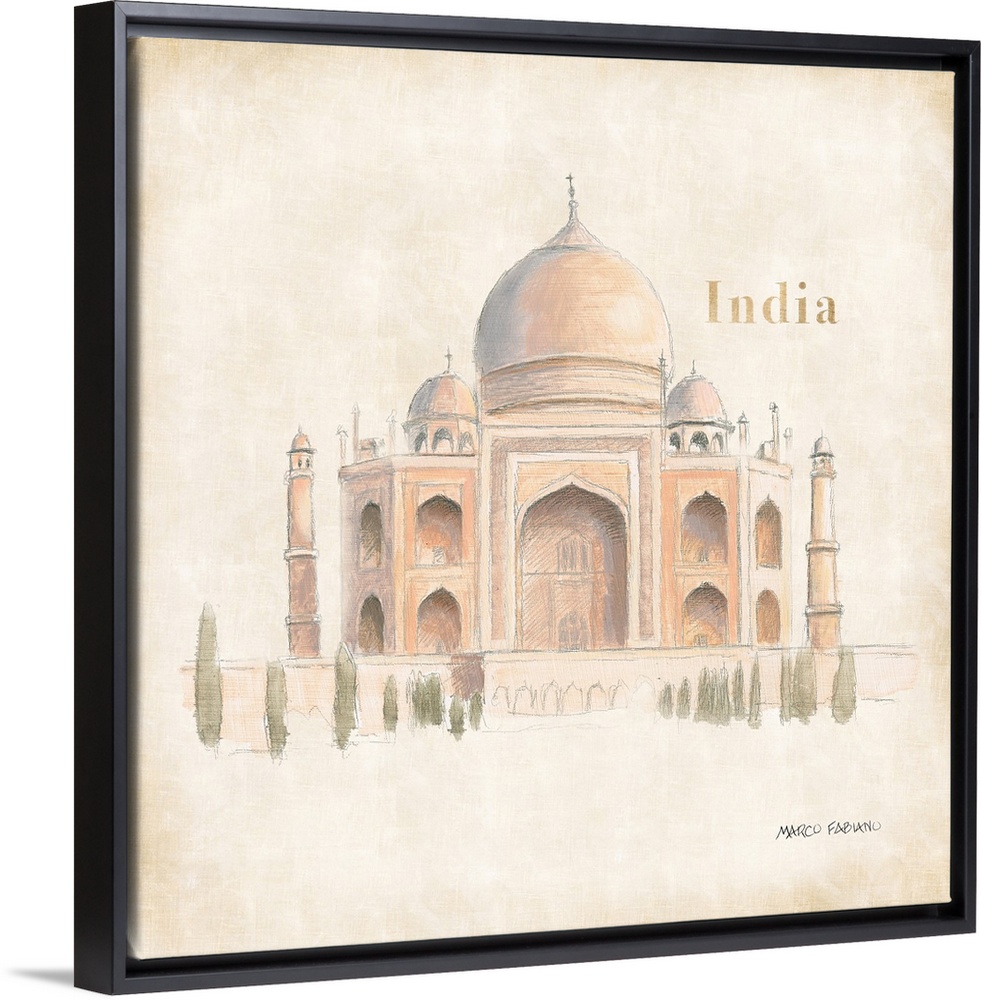 <p>Decorative artwork featuring an illustration of the Taj Mahal in India over an aged background.</p>