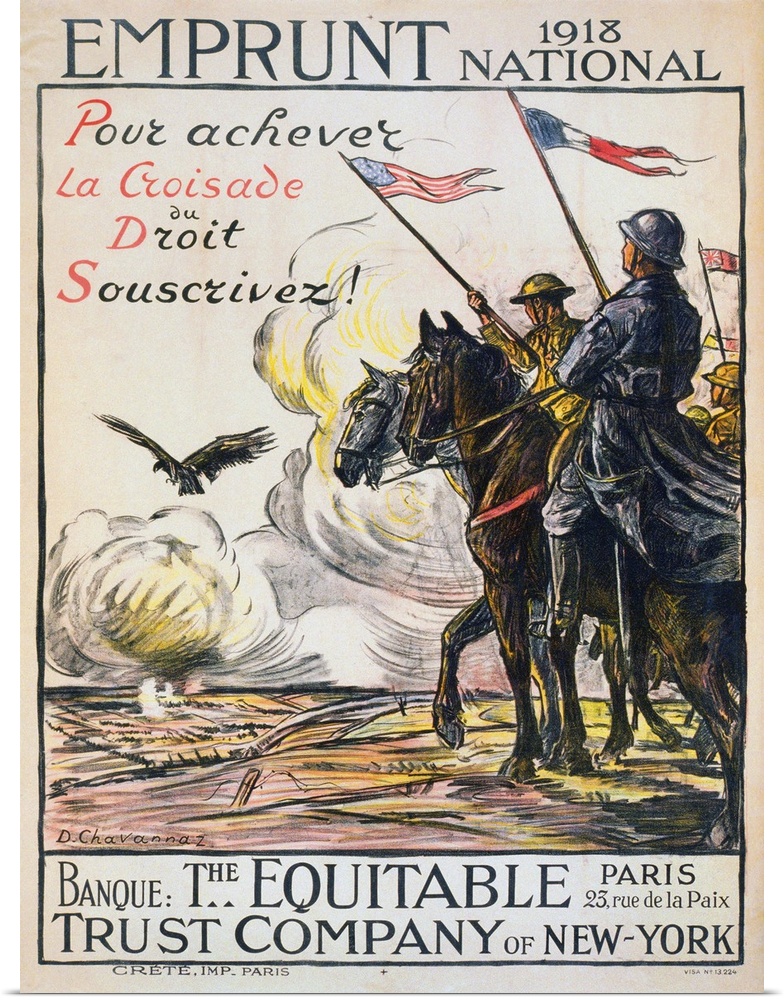 <p>'To Help the Right Triumph, Subscribe!' Soldiers on horses at the edge of a battlefield, carrying French and American flags. Lithograph poster, 1918, encouraging French citizens to purchase war bonds.</p>