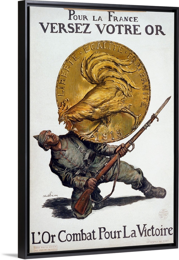 <p>'Deposit Your Gold for France. Gold Fights for Victory.' Poster depicting a large gold coin with a Gallic rooster on it crushing aGerman soldier. Lithograph poster by Abel Faivre, 1915, encouraging French citizens to trade their gold for paper money, as gold was needed to pay for foreign imports.</p>