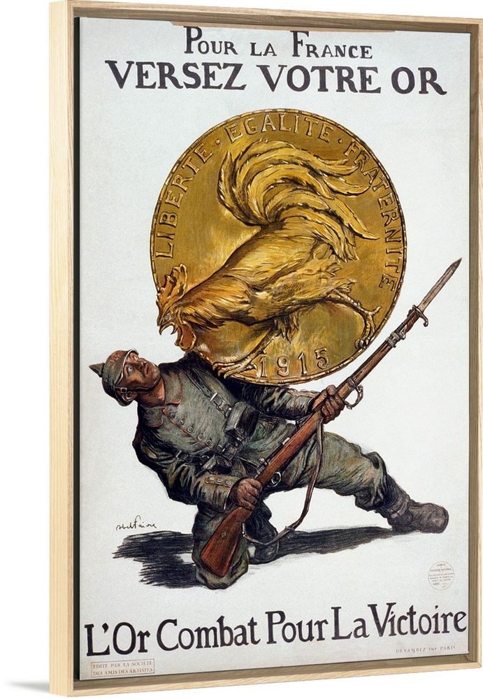 <p>'Deposit Your Gold for France. Gold Fights for Victory.' Poster depicting a large gold coin with a Gallic rooster on it crushing aGerman soldier. Lithograph poster by Abel Faivre, 1915, encouraging French citizens to trade their gold for paper money, as gold was needed to pay for foreign imports.</p>