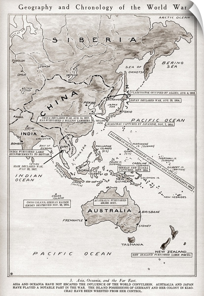 <p>World War I, Geography. Map Showing the Chronology And Geography Of the Effects Of World War I In Asia And Australia,</p>