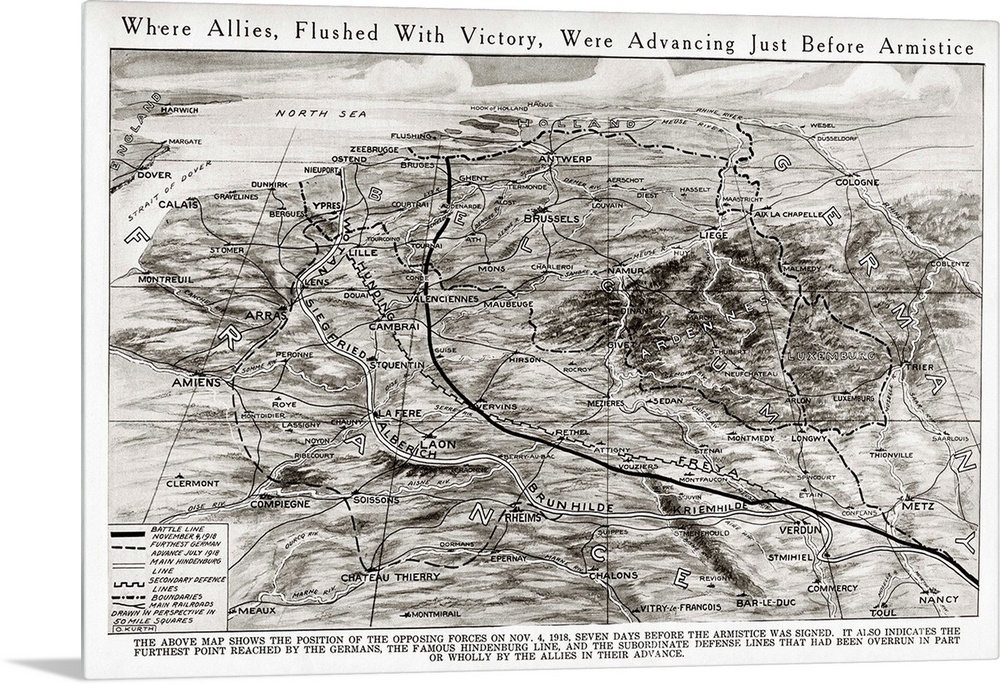 <p>World War I, Map, 1918. Map Showing the Position Of Forces On 4 November 1918, Seven Days Before the Armistice Was Signed. the Map Also Indicates the Hindenburg Line, the Furthest Point Reached By the Germans.</p>