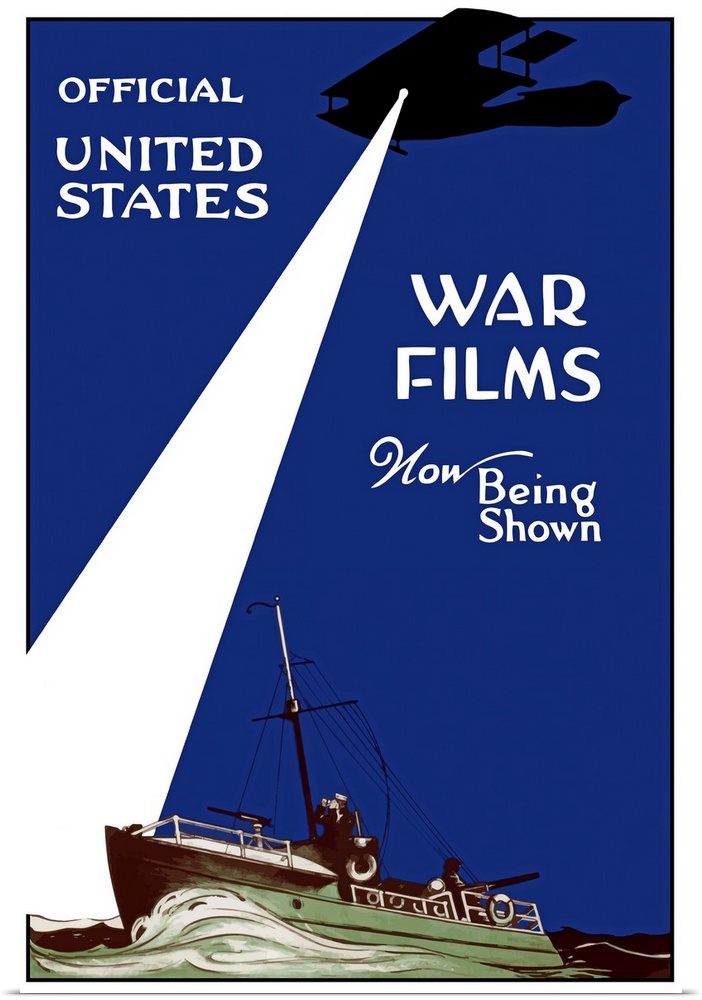 <p>Vintage World War I poster of a Navy patrol boat in the sea and a plane shining a spotlight. It reads, Official United States War Films Now Being Shown.</p>