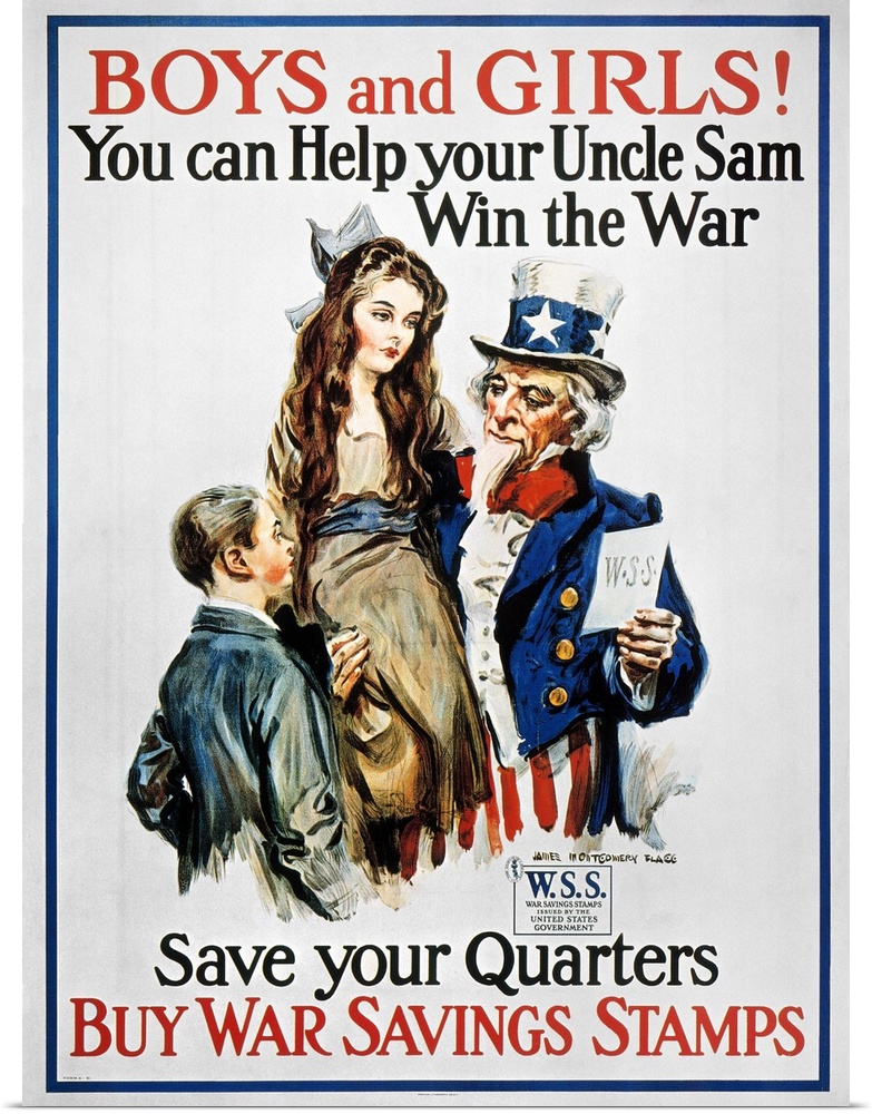 <p>'Boys and Girls! You Can Help Your Uncle Sam Win the War.' American World War I War Savings Stamp poster by James Montgomery Flagg.</p>