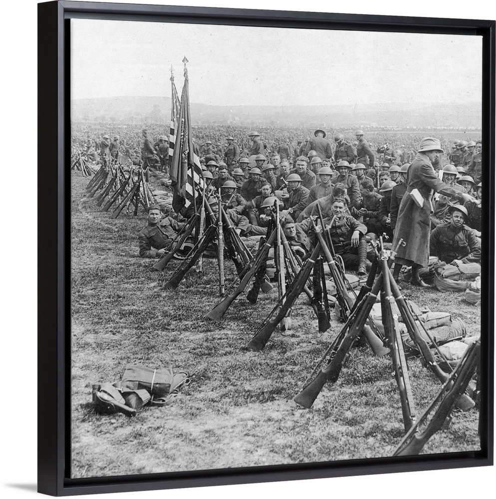 <p>Soldiers of the U.S. 89th Division relaxing in occuppied Germany near the Moselle River in 1919. A Y.M.C.A. worker is handing out cigarettes, candy, magazines, and writing paper. Stereograph, 1919.</p>