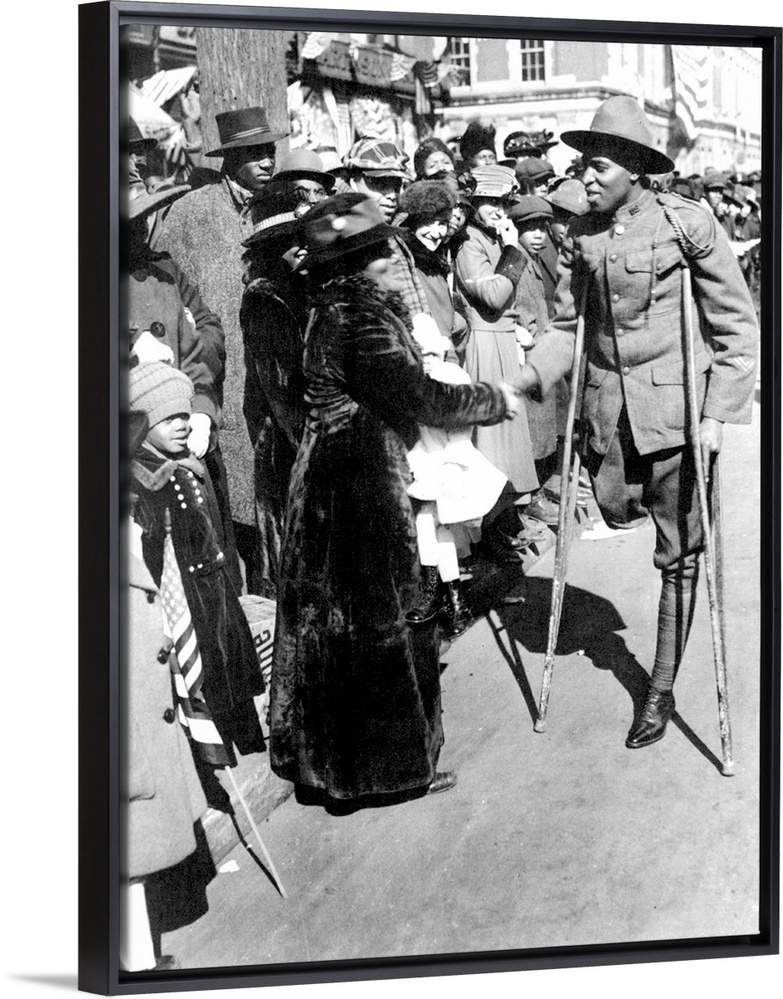 <p>A wounded veteran of the U.S. 369th Infantry Regiment is among the honored at the victory parade up Fifth Avenue, New York City, 17February 1919.</p>