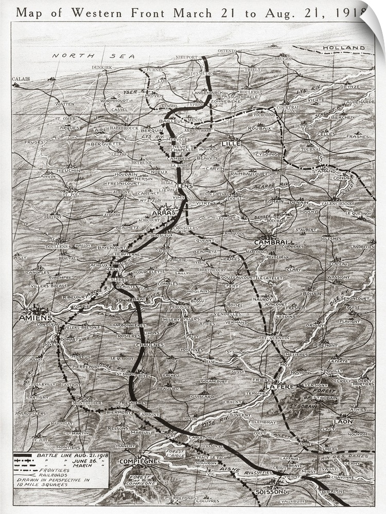 <p>World War I, Western Front. Map Depicting the Battle Line When the German Offensive Of March 21, 1918 Was Launched, the Furthest Point Reached In that Advance, And the Territory Recovered By August 21st During the Counterattack Led By Marshal Ferdinand Foch.</p>