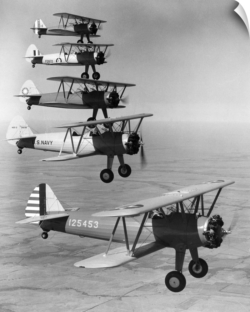 <p>Boeing military trainer airplanes bound for five different services (from top to bottom): Peru, Great Britain, China, U.S. Navy andU.S. Air Corps. Photographed during a demonstration, 1942.</p>